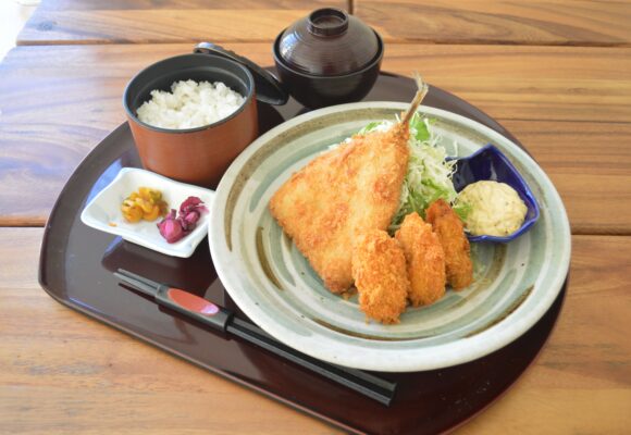 サクッとした衣に包まれたジューシーなカキフライとふっくら肉厚のアジフライを一緒に楽しめる贅沢な御膳です。