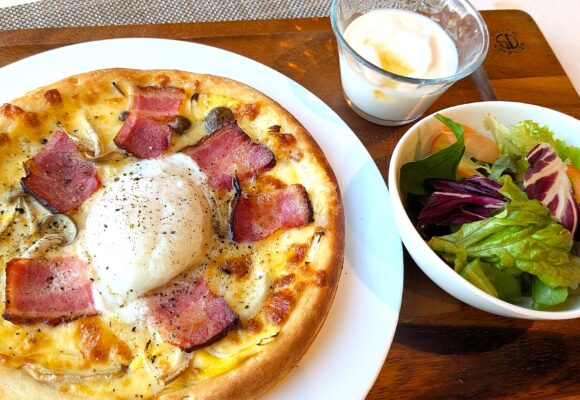 ベーコンの旨味と、とろ~りたまごと濃厚チーズが絶妙に絡む、カルボナーラ仕立てのピッツァです。チーズのコクと黒胡椒のアクセントがきいていて、贅沢な味わいです。