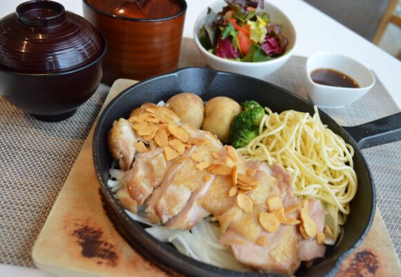 外はパリッと中はジューシーなチキンに香ばしいガーリックとコクが深い醤油ダレはごはんとの相性抜群です。