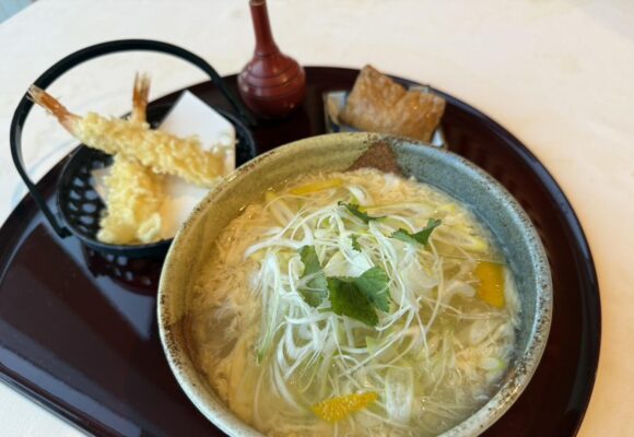 ふんわりたまごの優しいお出汁にほんのり香る柚子の風味。サクサクの海老天ぷらが彩りを添え、ほっとする味わいです。いなり寿司も付いて、しっかり満足できる一品です。