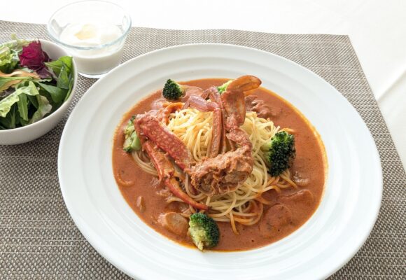 蟹の旨味を程よく引き出した、まろやかでコクのあるトマトクリームパスタです。重すぎない軽やかな口当たりで一口ごとに濃厚なうま味が広がる、見た目も華やかな一皿です。